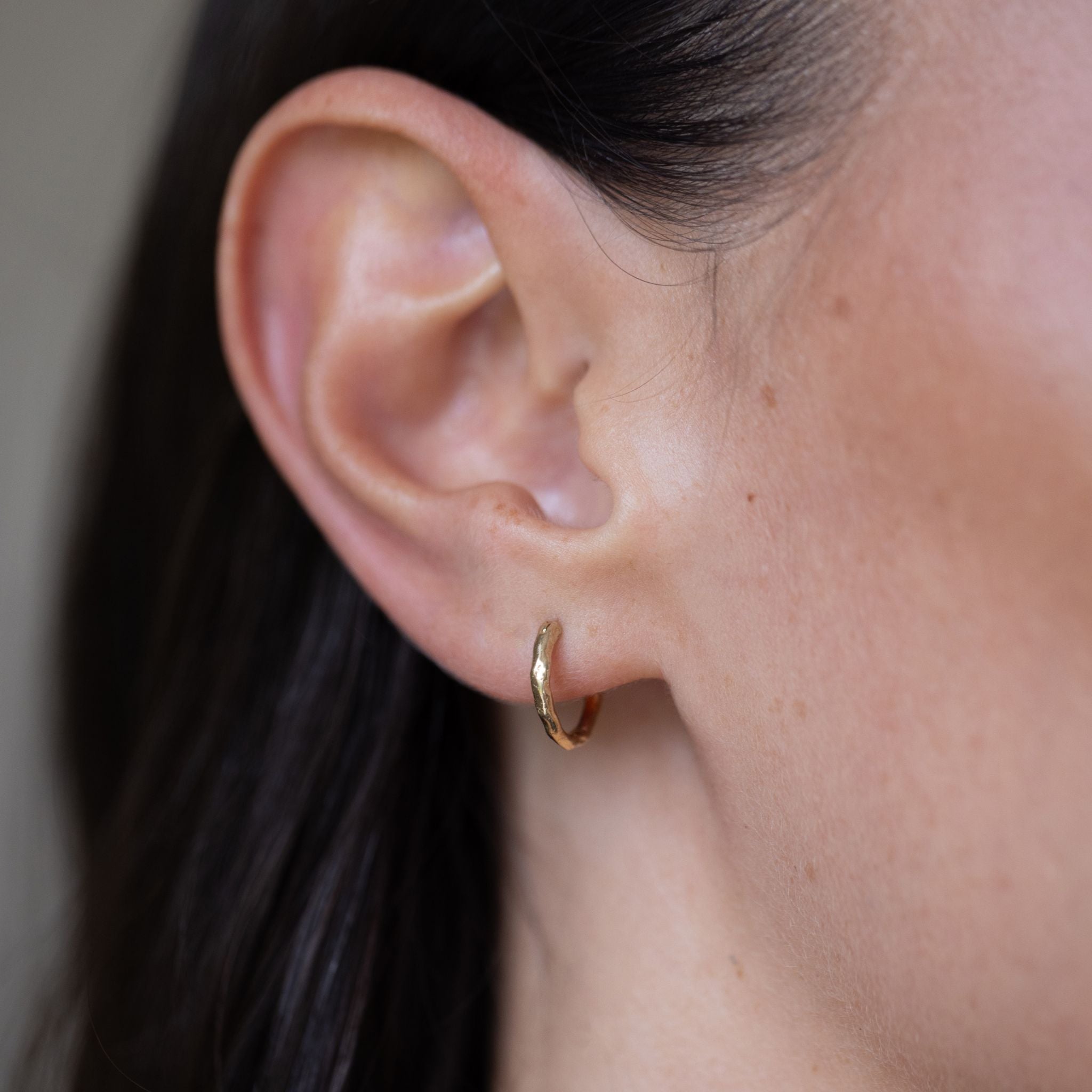 Huggie features a handcut natural round shape and is crafted from sterling silver or 18ct gold vermeil.