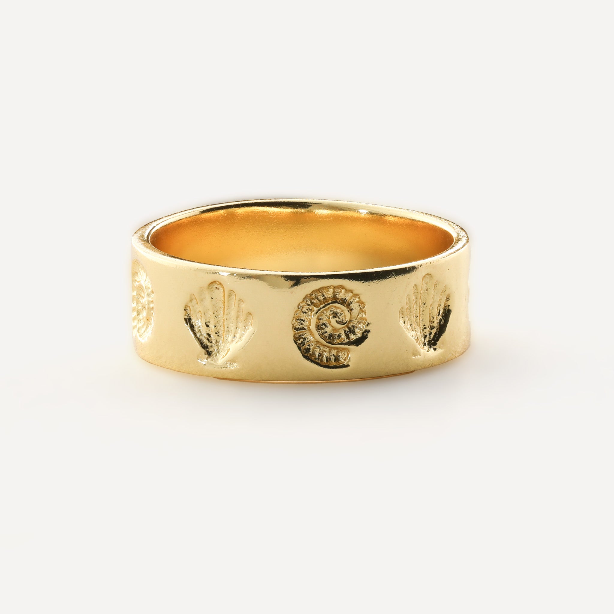Delicate scallop shells and little ammonites are engraved onto this band ring.