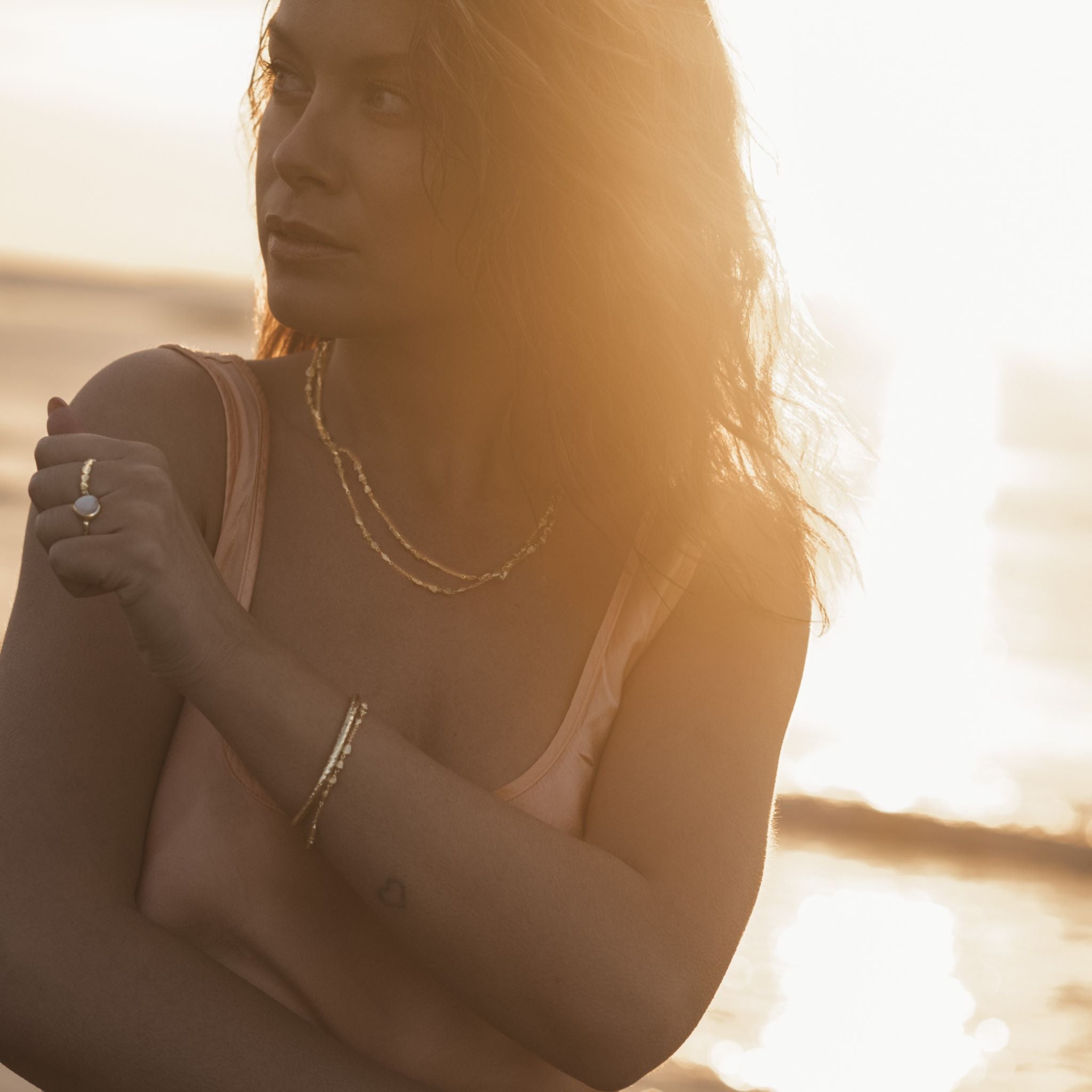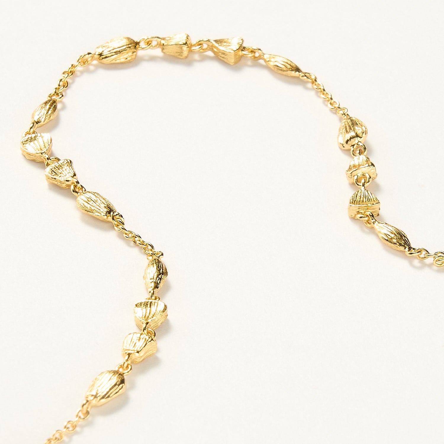 Channel the summer vibes with the Ella bracelet, featuring rows of tiny shells dotted along a sparkling chain.