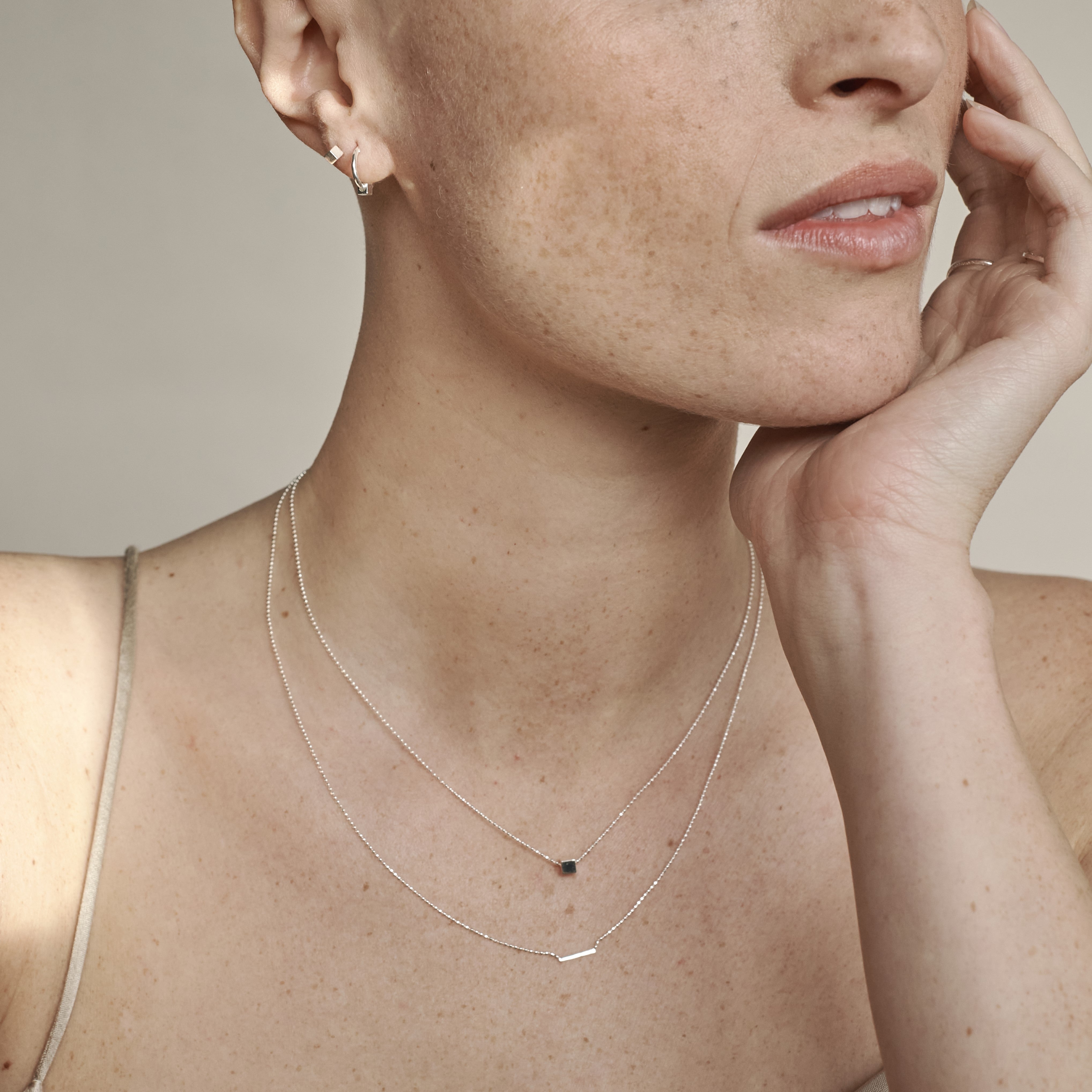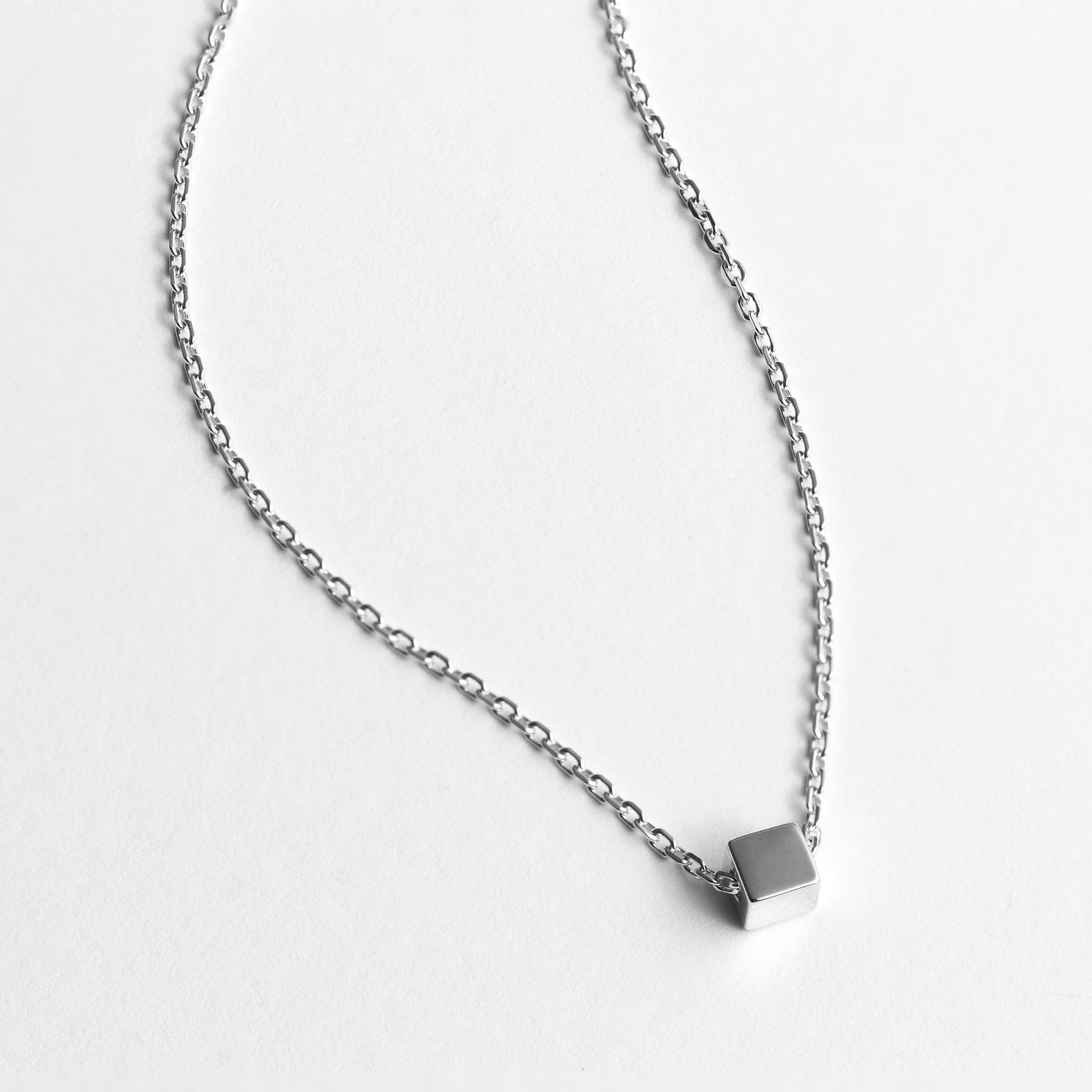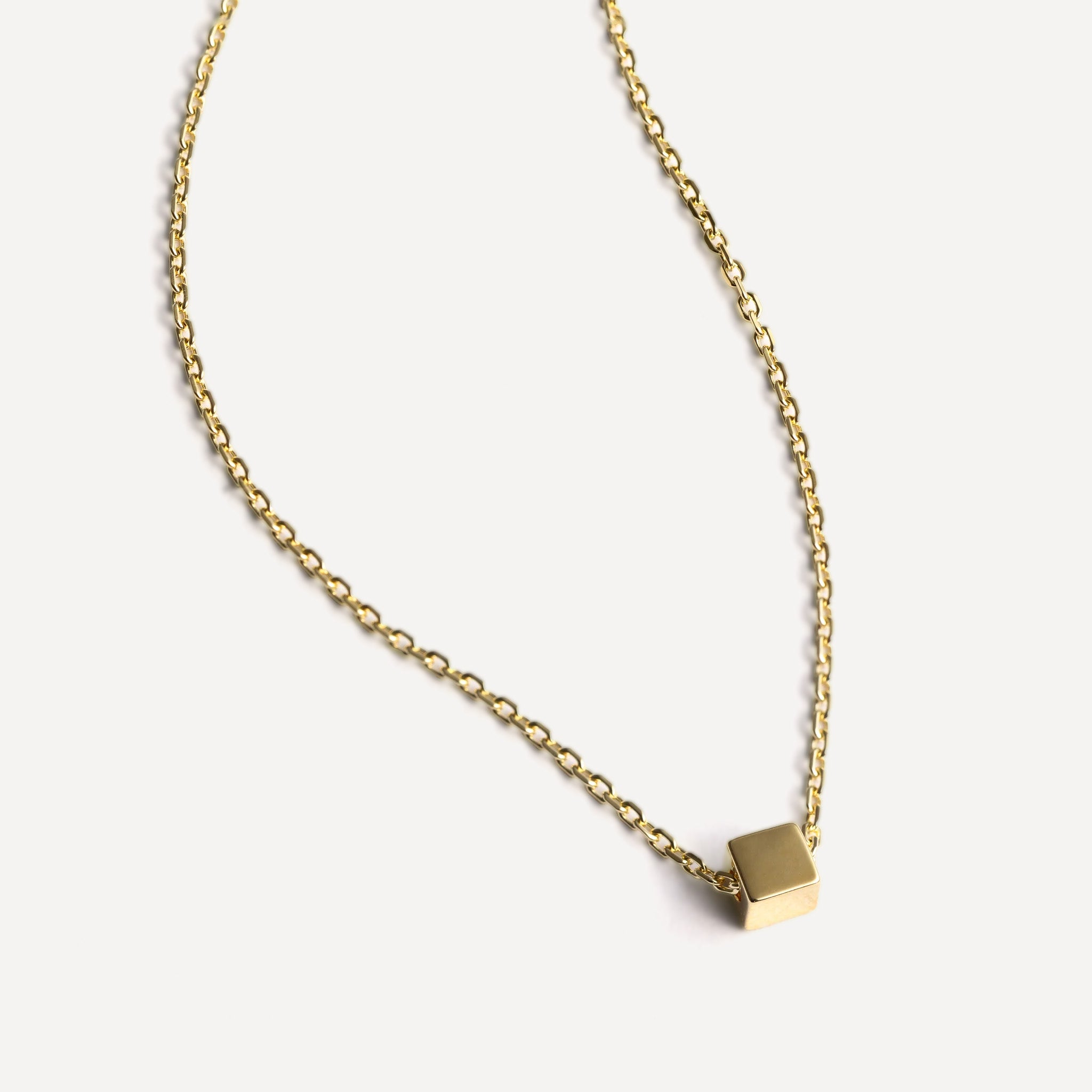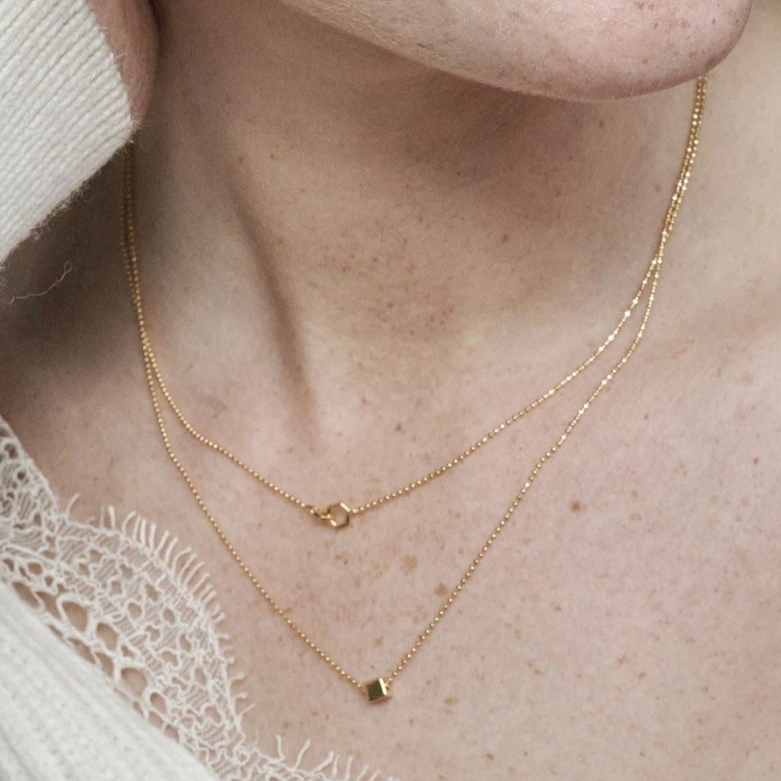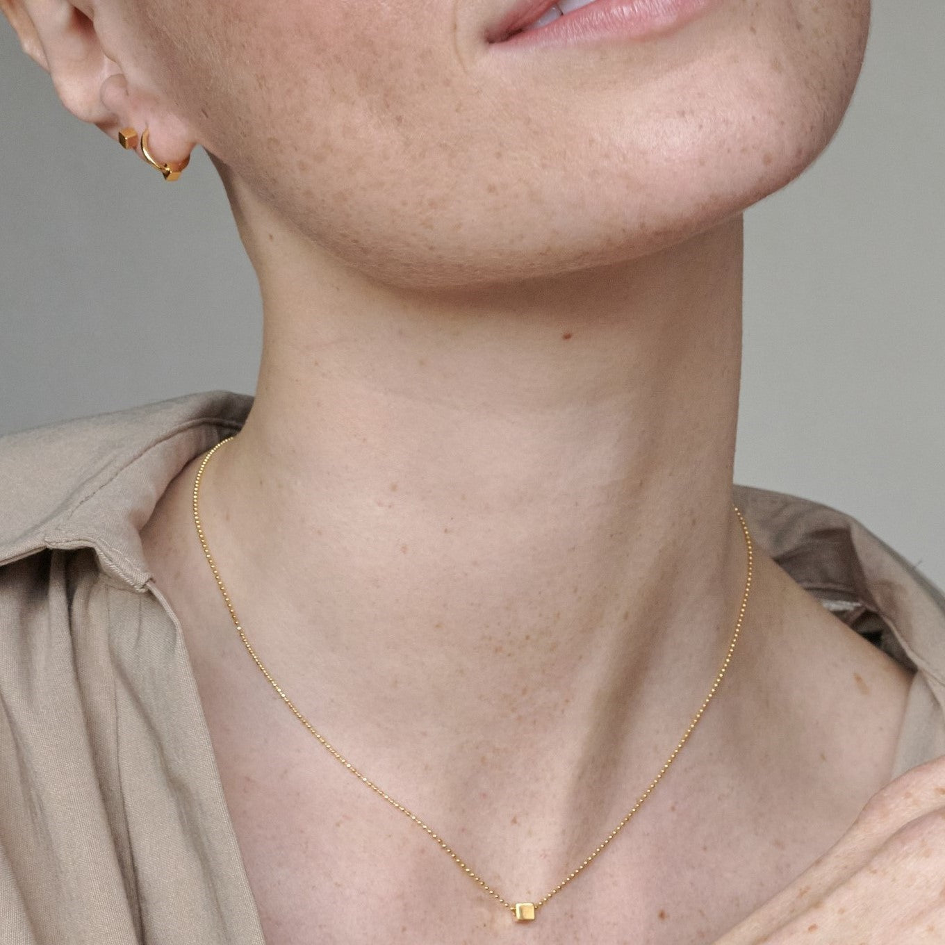 This tiny cube charm is threaded on a twinkling ball chain and is crafted in recycled sterling silver and coated in 18ct gold.