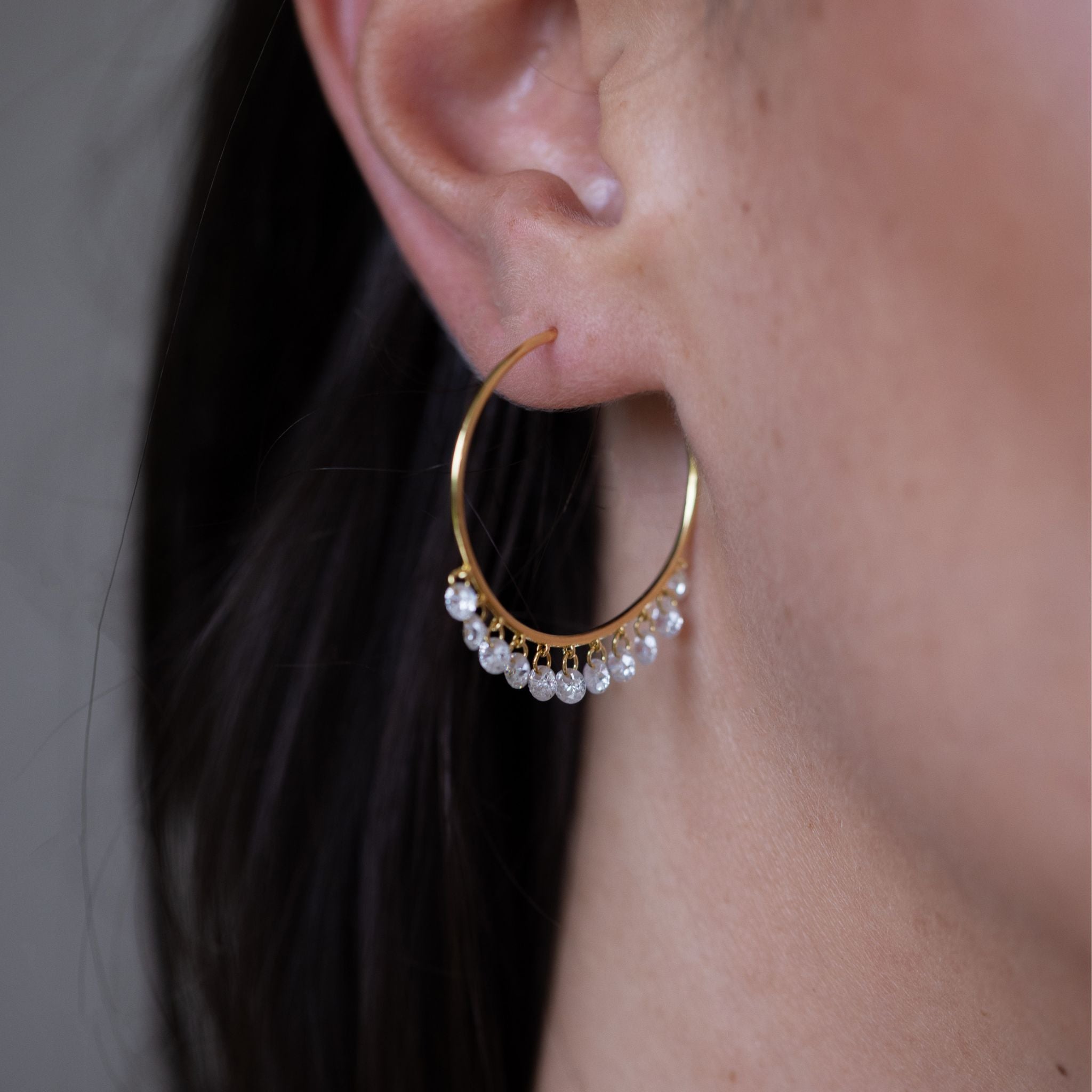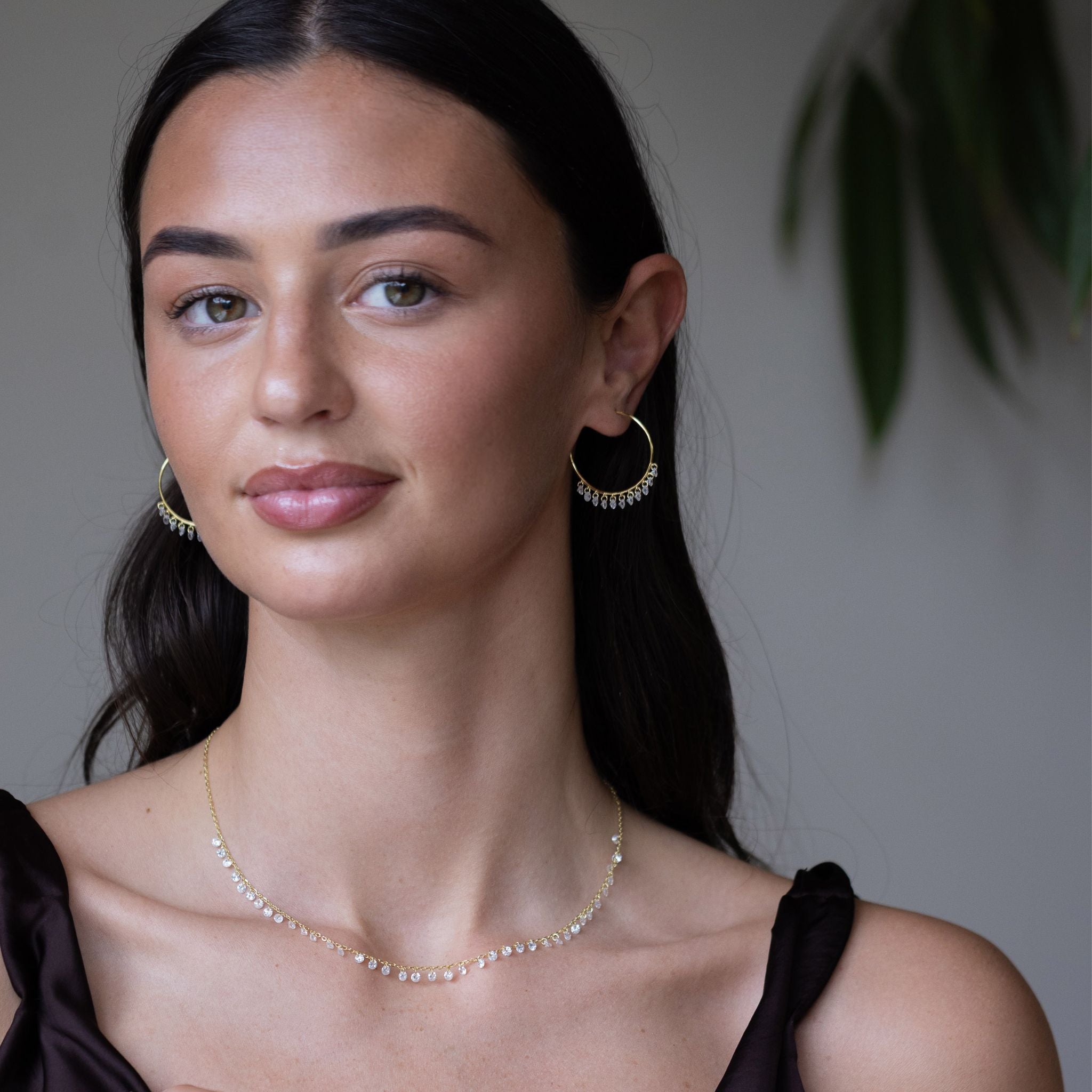 These hoops feature a galaxy of sparkling cubic zirconia, suspended magically for a delicate floating effect. The perfect addition to any ear stack, why not layer up with our Icon studs for a curated look?